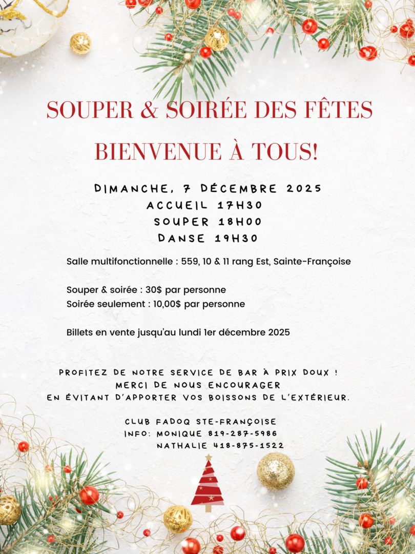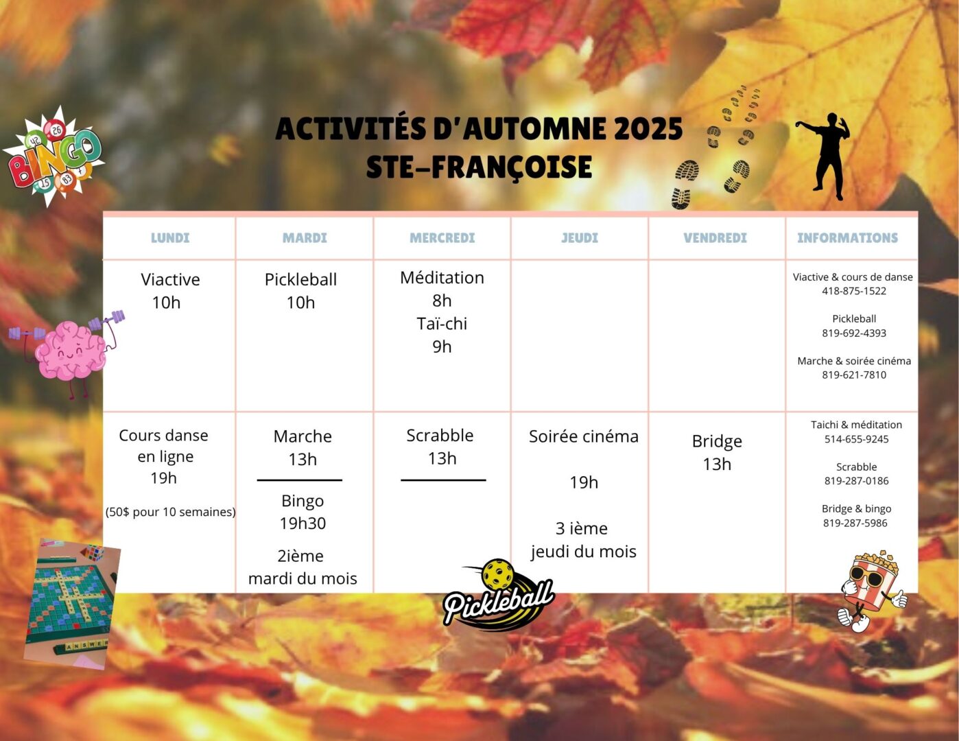 Consulter la page facebook pour plus de détails : Club FADOQ Ste-Francoise